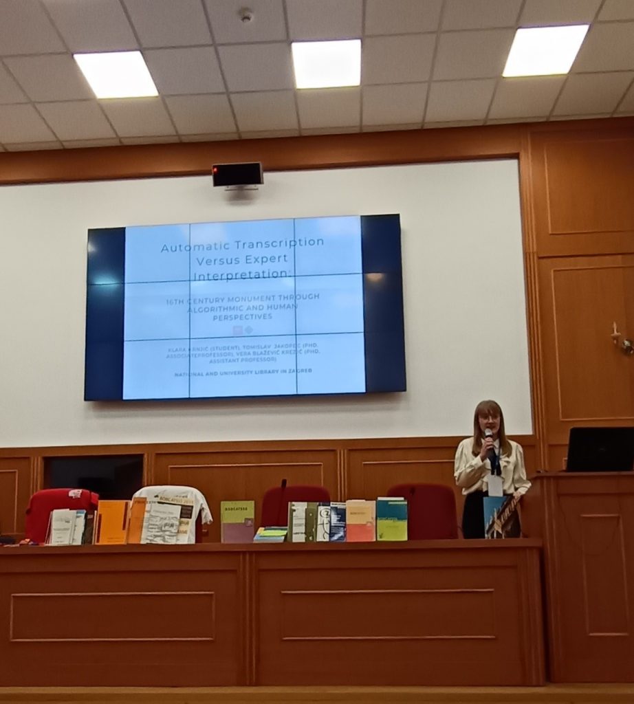 Izlaganje Pisana baština – zaštita i pristup u doba umjetne inteligencije održali su dr. sc. Ines Horvat, viša asistentica i prof. dr. sc. Damir Hasenay, kojim su dali pregled izazova s kojima se suočavamo pri uporabi umjetne inteligencije prilikom provođenja aktivnosti zaštite pisane baštine te njezinim pristupom i ponovnom uporabom.