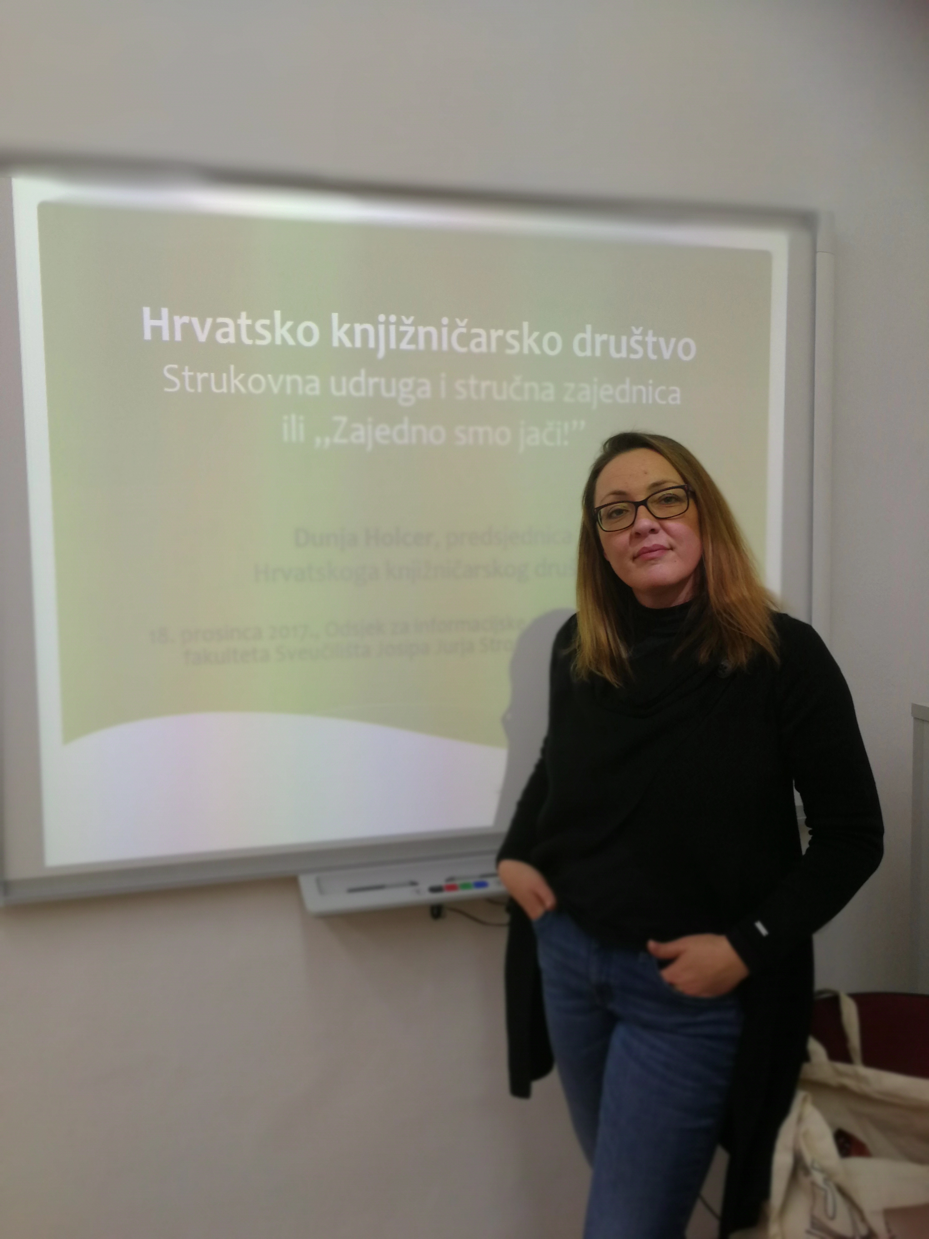 Dana 18. 12. 2017. na Odsjeku za informacijske znanosti boravila je Predsjednica Hrvatskog knjižničarskog društva (HKD) dr. sc. Dunja Holcer koja je studentima 1. godine preddiplomskog studija Informatologije, u okviru kolegija “Teorija i praksa informacijskih djelatnosti”, održala predavanje o važnosti profesionalnog umrežavanja. Pri tome se posebno osvrnula na aktivnosti HKD-a (znanstvene i stručne projekte, međunarodno djelovanje, izdavačku djelatnost, ulogu u razvoju nacionalne politike i zakonodavstva koje se odnosi na knjižnice i informacijske stručnjake itd.) i prednosti članstva u tom udruženju. Istog je dana Dunja Holcer, na poziv Kluba Libros održala predavanje i za studente diplomskog studija Informatologije.