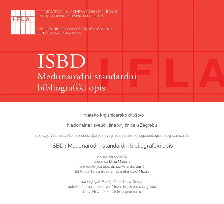 Svečano predstavljanje novog izdanja temeljnog bibliografskog standarda ISBD: međunarodni standardni bibliografski opis održat će se u ponedjeljak, 9. veljače 2015. u 13:00 u Nacionalnoj i sveučilišnoj knjižnice u Zagrebu. Ovo objedinjeno izdanje ISBD-a zamjenjuje sva dosadašnja izdanja specijaliziranih ISBD-ova za pojedine vrste knjižnične građe te predstavlja vrijedeći IFLA-in standard za bibliografski i kataložni opis svih vrsta građe. Knjigu je prevela dr. sc. Ana Barbarić, a stručna je redaktorica prijevoda dr. sc. Mirna Willer.