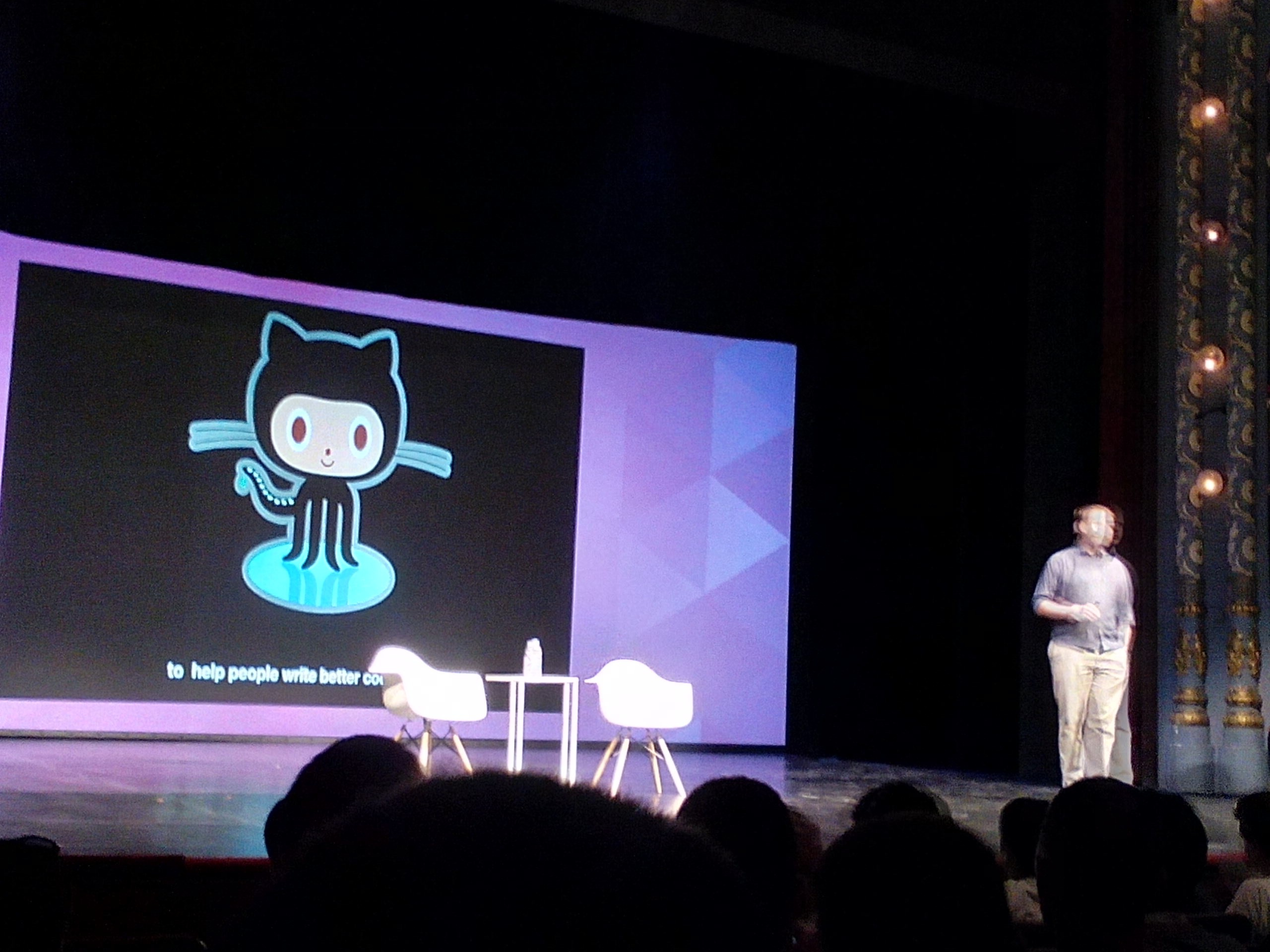 Drugi dan konferencije započeo je nešto malo kasnije od prvoga (vjerojatno pametno proračunato gledajući na afterparty noć ranije), tako da smo se uspjele odmoriti i skupiti energije za drugi, još uzbudljiviji dan pred nama. Zagrijavanje prezentacijom o strategiji razvoja proizvoda u svijetu startup-a započeo je Des Traynor iz Intercoma. Iako je održao podosta zanimljiv govor, u zraku se osjetila nestrpljivost publike za onim što slijedi nakon njega. To je posebno došlo do izražaja kada je u svojoj prezentaciji (slučajno ili namjerno, nismo sigurne), prikazao sliku Octocat maskote uz tekst „to help people write better code“.
