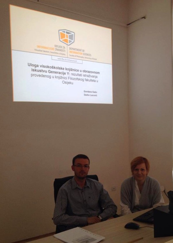 U sklopu Otvorenog četvrtka na Filozofskom fakultetu u Osijeku Gordana Gašo, voditeljica knjižnice Filozofskog fakulteta u Osijeku i Darko Lacović, asistent na Odsjeku za informacijske znanosti Filozofskog fakulteta Osijek održali su 28. svibnja 2015. godine izlaganje pod nazivom Uloga visokoškolske knjižnice u obrazovnom iskustvu Generacije Y u kojem su predstavili rezultate istraživanja provedenog pomoću ankete u knjižnici Filozofskog fakulteta u Osijeku.