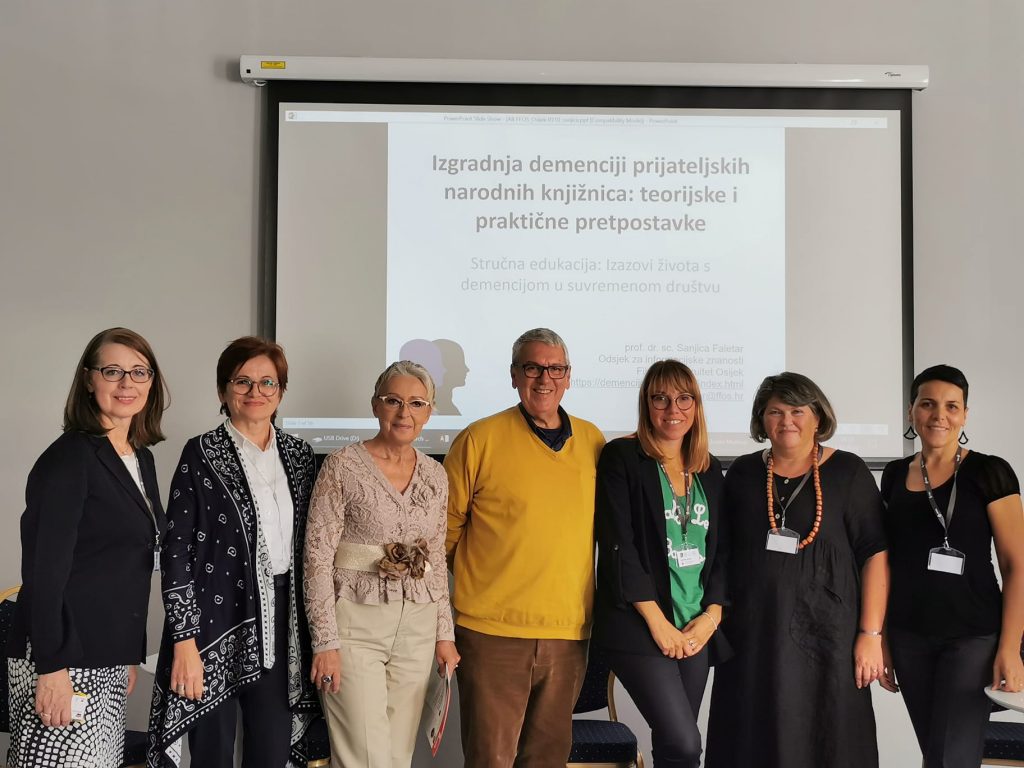 Dana 14. 10. 2022. na Filozofskom fakultetu Osijek održana je besplatna stručna edukacija o Alzheimerovoj bolesti pod naslovom Knjižnični programi i građa za osobe s demencijom. Nakon izlaganja o rehabilitaciji osoba s demencijom u zajednici i upoznavanja s nefarmakološkim metodama liječenja, uslijedio je niz predavanja o knjižničnoj građi i programima prilagođenima starijim osobama i osobama s demencijom. Održana je i radionica tipa training the trainer za knjižničare i studente o organizaciji aktivnosti vođenog čitanja za starije osobe koje mogu pridonijeti usporavanju razvoja bolesti i njihovom kognitivnom osnaživanju, društvenom uključivanju te podizanju samopouzdanja.