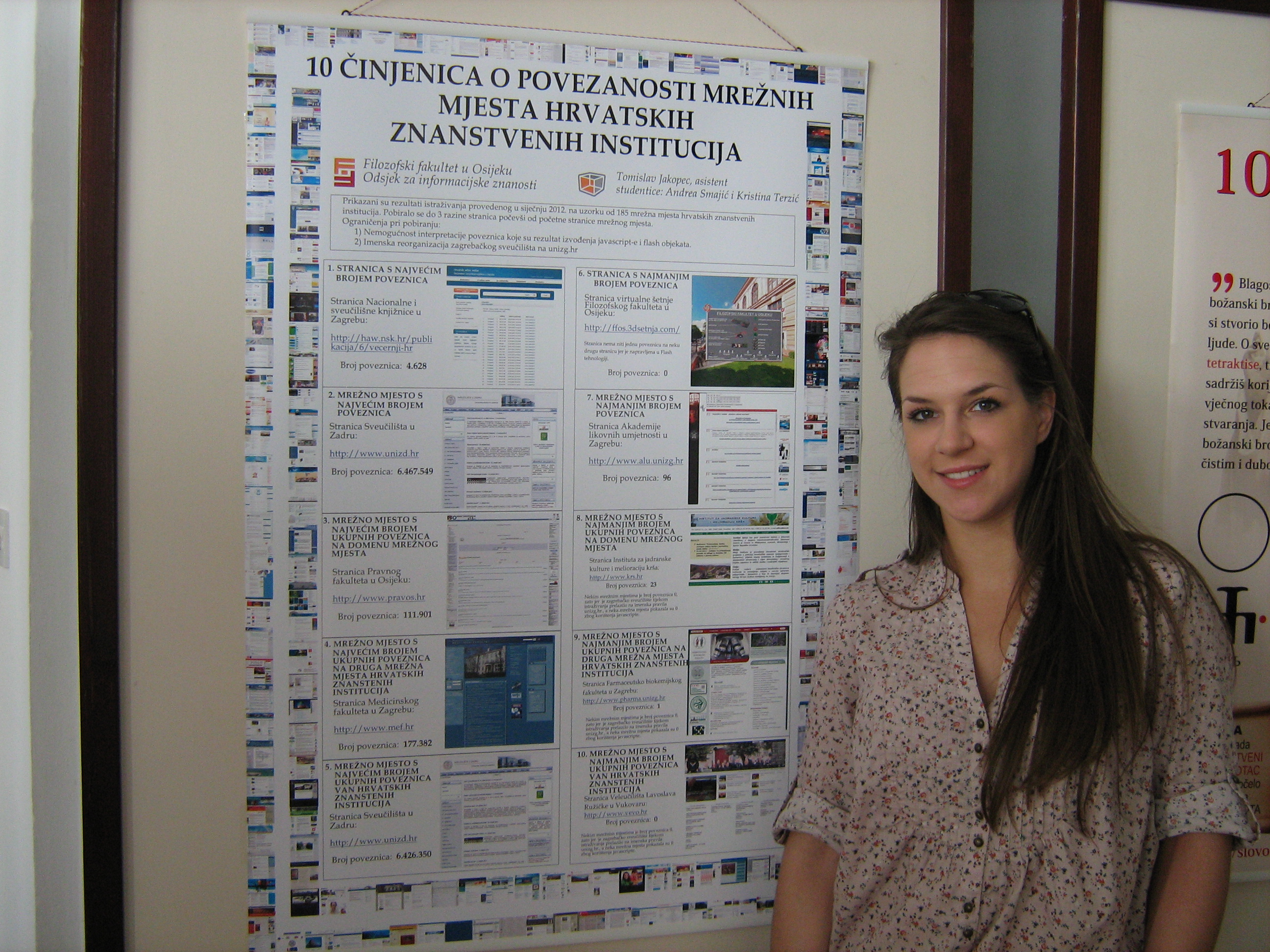 znanosti koji se održava u Osijeku od 23. do 27. travnja 2012. sudjeluju Tomislav Jakopec i studentice Kristina Terzić i Andreja Smajić poster-izlag anjem na temu 10 činjenica o povezanosti mrežnih mjesta hrvatskih znanstvenih institucija. Zoran Velagić i Josipa Selthofer predstavljaju poster na temu Kultura bestselera: 10 najboljih, 10 najprodavanijih ili tiranija novog?. Anita Papić sa studenticama Ivom Arači i Ivanom Čadovskom predstavit će poster 10 zapovijedi pretraživanja znanstvenih baza podataka. Posteri se mogu vidjeti u zgradi Rektorata svaki dan od 23. do 27. travnja 2012.