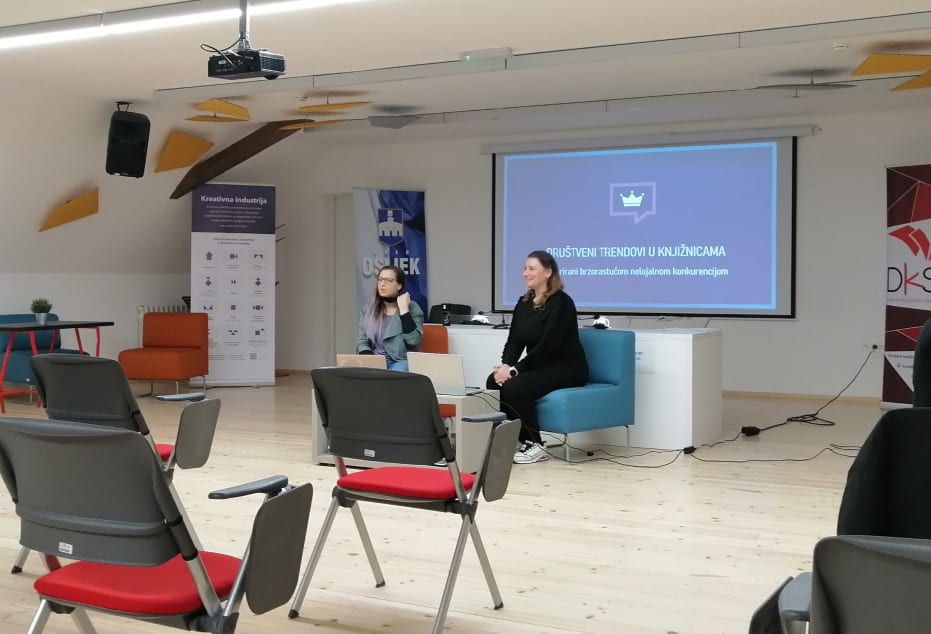 Dana 29. listopada 2021. godine u prostorima Kulturnog centra „Stare pekare“ održana je radionica pod nazivom „Knjižnice za 21. stoljeće: Društveni trendovi u knjižnicama inspirirani brzorastućom nelojalnom konkurencijom ili Mi to radimo bolje, s knjigama i za manje novaca“, pod pokroviteljstvom Društva knjižničara Slavonije, Baranje i Srijema i Gradske i sveučilišne knjižnice Osijek. Na radionici je sudjelovala studentica 2. godine dvopredmetnog diplomskog studija informatologija-informacijska tehnologija, Dunja Habek. Radionicu su vodile Ivanka Ferenčić Martinčić iz Narodne knjižnice Virje i Maja Lesinger iz Knjižnice i čitaonice Grada Preloga. Na radionici se raspravljalo o rastućim problemima u knjižničnom svijetu te promjenama u percepciji korisnika unatrag 10-ak godina. Najveći naglasak se stavio na potrebu identifikacije „nevidljive“ konkurencije te načine na koje se knjižnica može prilagoditi novom tržištu potreba i zadržati svoje korisnike. Naime, promjenama u društvu i društvenim trendovima knjižnice više ne drže monopol nad uslugama i servisima koje su nudile pred dva desetljeća. Pojavom igraonica, škola stranih jezika, kafića, udruga i drugih ustanova koje nazivamo nevidljivom konkurencijom započinje natjecanje za pažnjom korisnika. Na radionici su se voditeljice, uz komunikaciju sa polaznicima, dotakle načina na koji se knjižničari mogu prilagoditi novonastaloj situaciji u društvu, podijelile su hvalevrijedne primjere usluga i radionica koje knjižnice u 21. stoljeću mogu ponuditi svojim korisnicima kako bi zadržale njihovu lojalnost. Neke od takvih usluga su pub kvizovi u knjižnici, tematske izložbe, izrada prirodne kozmetike, ljetno kino, škole stranih jezika i sl. Nakon izlaganja održane su i dvije nekonvencionalne knjižnične radionice: LARP (Live Action Role Playing) Autobusna stanica te Art terapija u knjižnici.