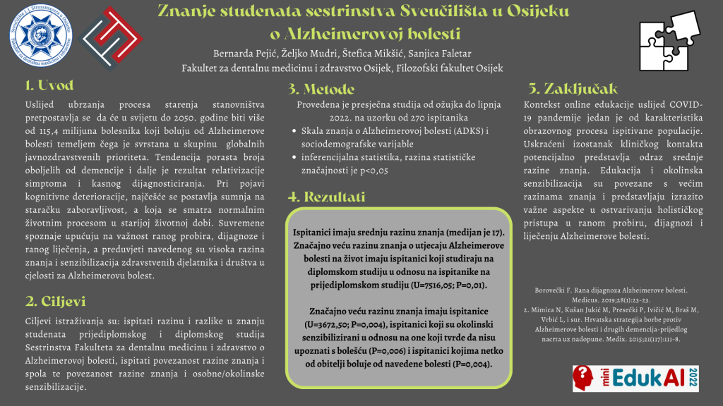 Lucija Grgić, Ena Maurus i Sanjica Faletar sudjelovale su s posterskim izlaganjem “Knjižnice i demencija: stručne aktivnosti Filozofskog fakulteta Osijek” na 8. edukativnoj konferenciji o Alzheimerovoj bolesti i drugim demencijama te su predstavile stručne aktivnosti provedene u okviru projekta “Izgradnja demenciji prijateljskih narodnih knjižnica”. Konferencija se održala 20. i 21. 12. 2022. godine u Zagrebu (online). Na istoj konferenciji Bernarda Pejić, Željko Mudri, Sanjica Faletar i Štefica Mikšić održali su postersko izlaganje “Znanje studenata sestrinstva Sveučilišta u Osijeku o Alzheimerovoj bolesti”.